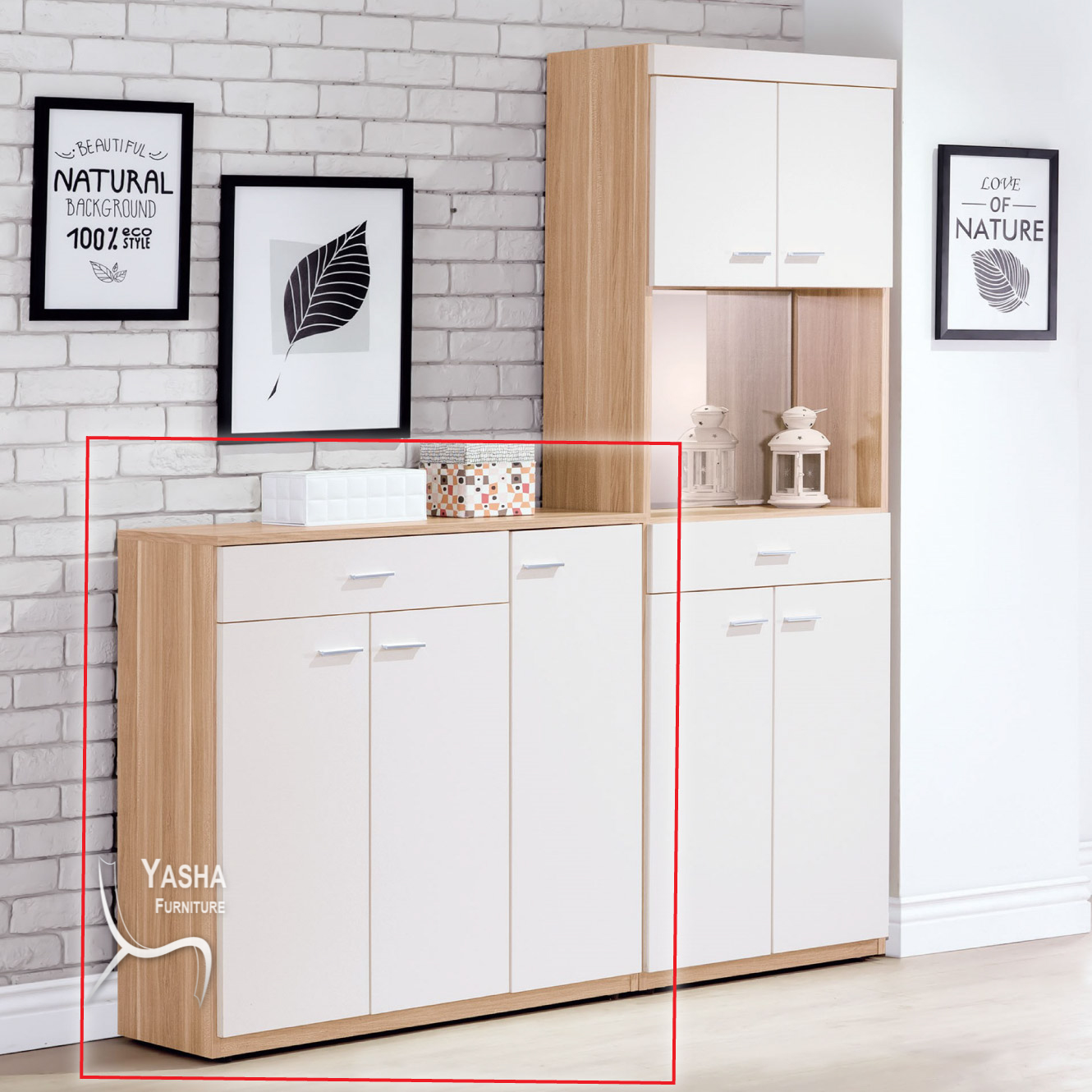 寬90×深32×高92cm 1. 正面木心板材質,PVC耐磨塗裝 2. 檯面、側板木心板材質,耐磨塗裝木紋經特殊立體處理 3. 亮面金屬把手,5mm鏡面 4. 抽屜採用鋼珠滑軌、門片採油壓式鉸鍊 5. 台灣製造 6. 可訂製