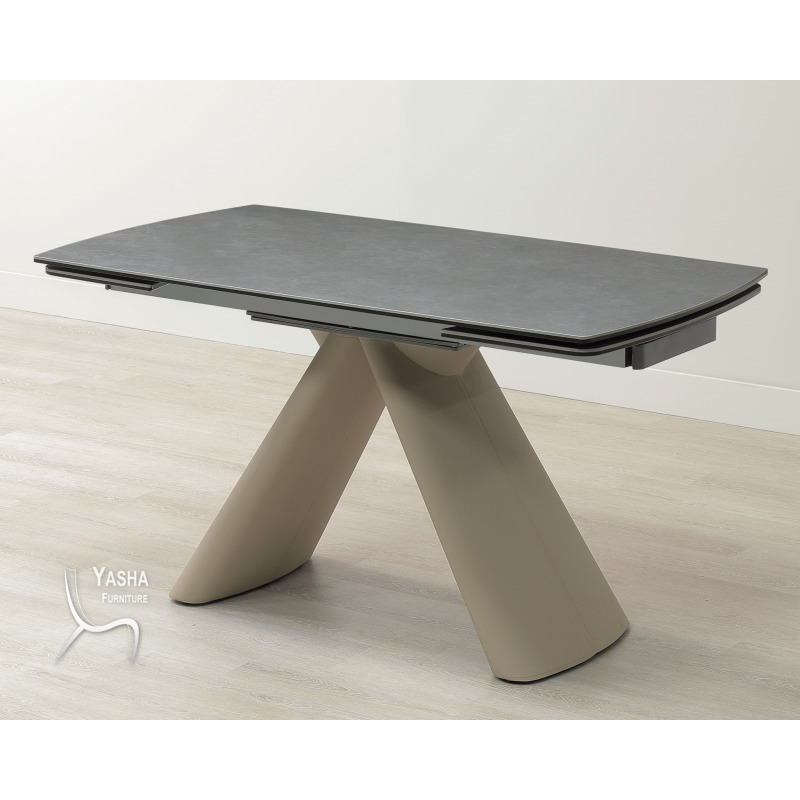展開:寬200×深80×高77cm 收合:寬140×深80×高77cm 1. 採6mm維克淺灰陶板貼合8mm強化玻璃桌面,耐熱抗污好清理特性 2. 採出口專用五金伸縮架 3. 金屬鐵片加工腳架,全包覆馬鞍皮革 4. 不可訂製