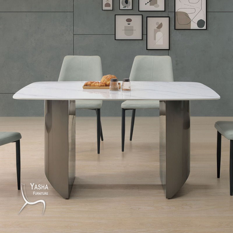 寬140×深80×高76cm 1. 採厚12mm亮面雪山白人工強化岩板桌面 2. 金屬加工腳架經灰鈦色電鍍處理 3. 不可訂製