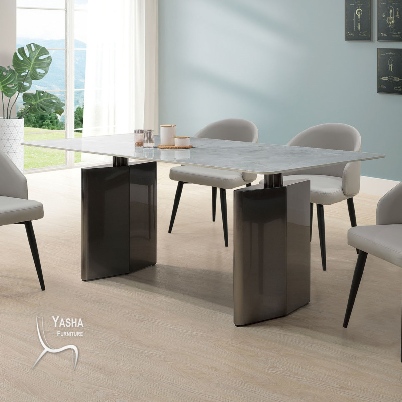 寬181×深91×高75cm 1. 亮面12mm冰玉白岩板面貼合木底板 2. 腳座採不鏽鋼經灰鋼色電鍍處理 3. 不可訂製