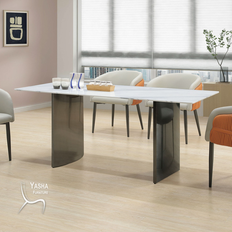寬180×深80×高75cm 1. 亮面12mm比利白通體岩板貼合木底板 2. 腳座採金屬不鏽鋼經灰鋼色電鍍處理 3. 不可訂製
