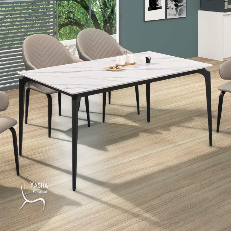 寬140×深80×高74cm 1. 採厚12mm平光雪山白人工強化岩板桌面 2. 金屬鐵管加工腳架 3. 黑鐵砂防鏽漆處理 4. 不可訂製